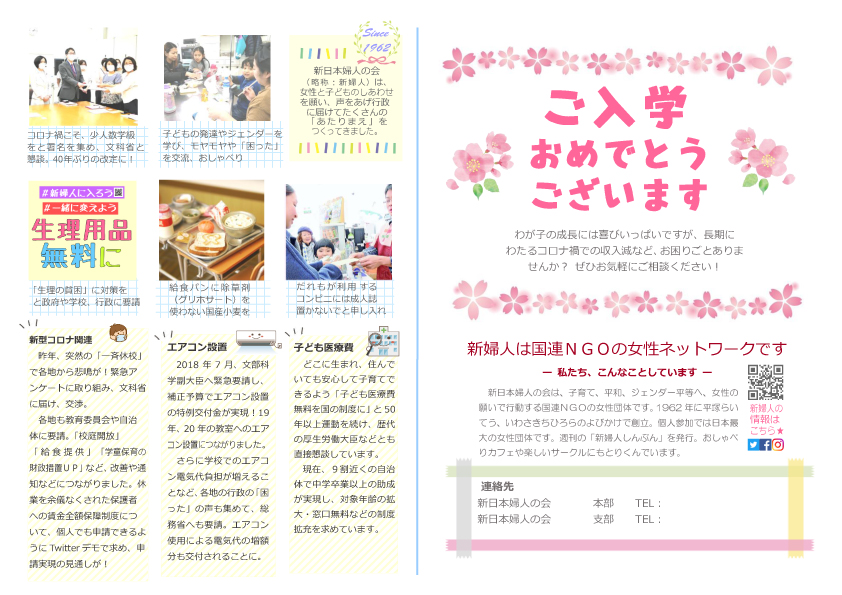 2021年「入学おめでとう」就学援助制度紹介チラシ 表面(ダウンロード)