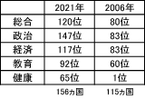 世界経済フォーラムが3月31日発表した「2021年ジェンダーギャップ報告」で、日本の男女平等度は過去最低となった前回(2019年12月)の153カ国中121位から156カ国中120位へ、一つ順位を上げたが過去2番目に低く、先進国最下位は変わらない。