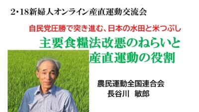 2月18日、新日本婦人の会が開催した「新婦人オンライン産直運動交流会議」で、農民運動全国連合会(農民連)の長谷川敏郎会長を講師に「主要食糧法改悪のねらいと産直運動の役割」を学びました。長谷川会長の講演をYouTubeで紹介します。
