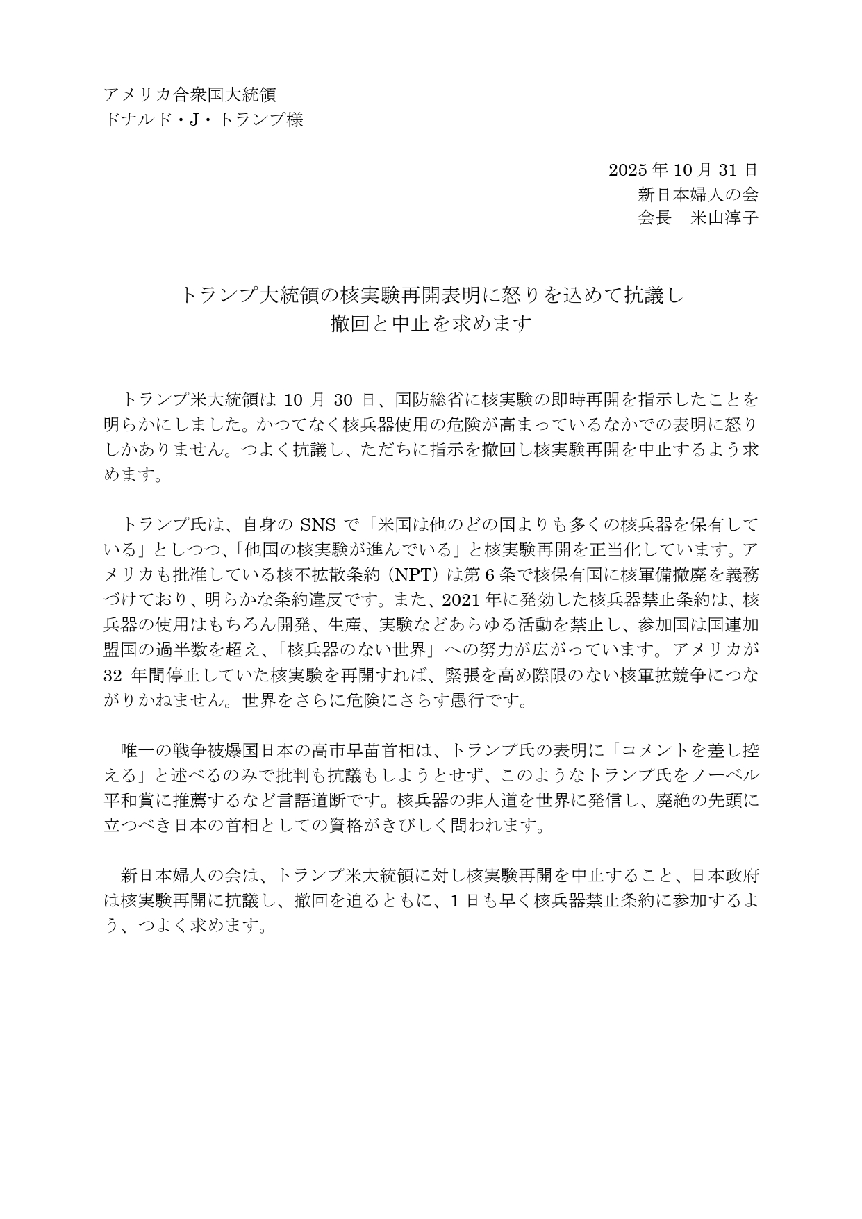 新日本婦人の会は10月31日、10月30日のトランプ大統領による核実験再開表明に怒りを込めて抗議し、撤回と中止を求める抗議文をアメリカ大使館へ送りました。