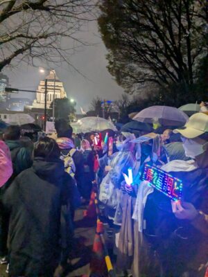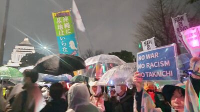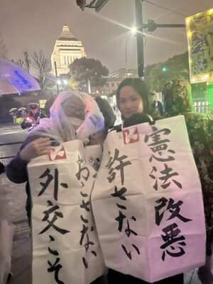 高市政権がめざす憲法改正に反対し、米国・イスラエルのイランへの攻撃に抗議するため、国会前で3月25日夜、「平和憲法を守るための緊急アクション」がおこなわれ(市民団体「WE WANT OUR FUTURE」、憲法9条を壊すな!実行委員会主催)、新婦人からも多数参加。雨の中、参加した約2万4000人は国会周辺の歩道を埋め尽くし、プラカードやペンライトを手に「9条守れ」「武力で平和はつくれない」など、コールを繰り返した。