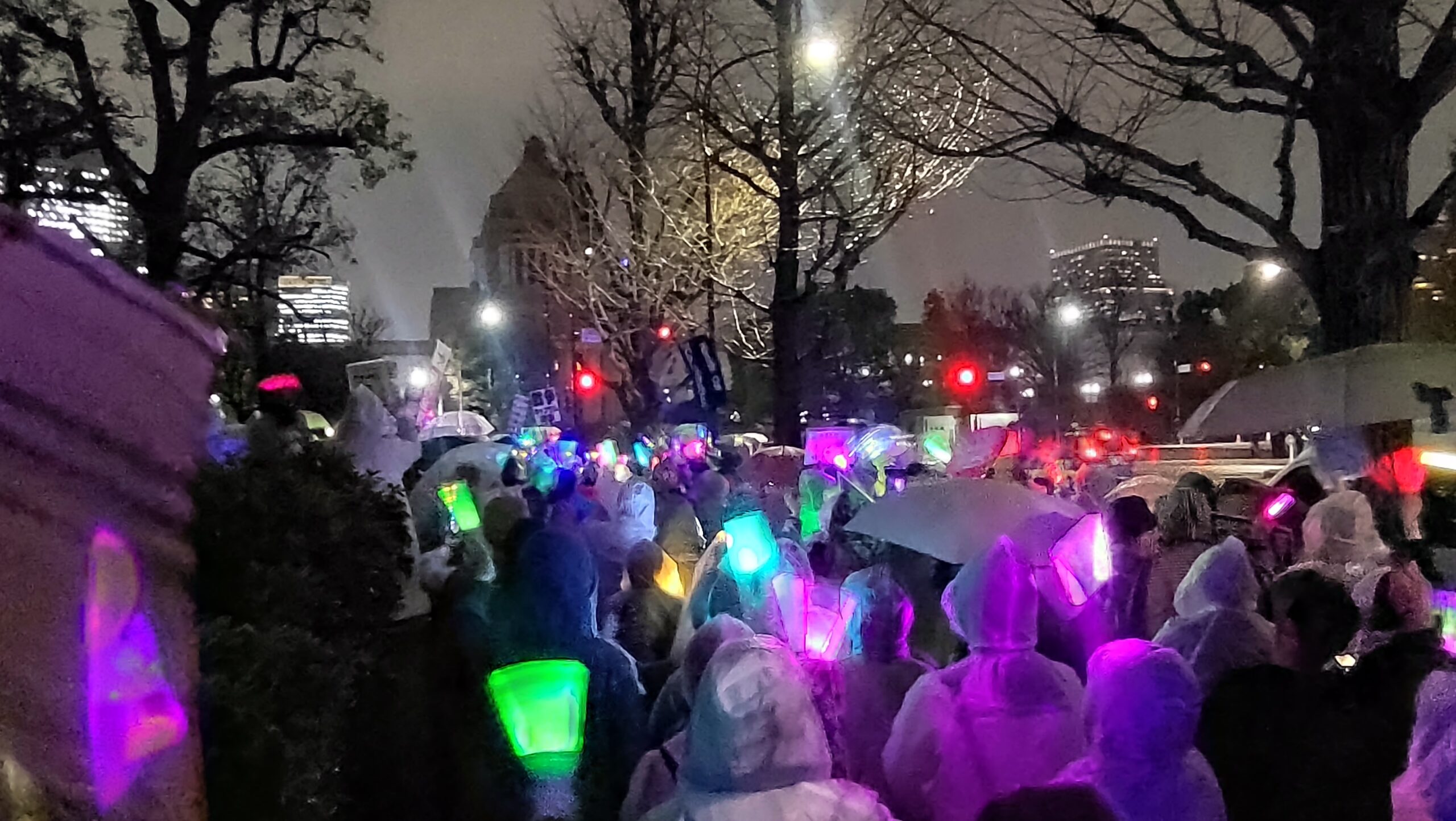 高市政権がめざす憲法改正に反対し、米国・イスラエルのイランへの攻撃に抗議するため、国会前で3月25日夜、「平和憲法を守るための緊急アクション」がおこなわれ(市民団体「WE WANT OUR FUTURE」、憲法9条を壊すな!実行委員会主催)、新婦人からも多数参加。雨の中、参加した約2万4000人は国会周辺の歩道を埋め尽くし、プラカードやペンライトを手に「9条守れ」「武力で平和はつくれない」など、コールを繰り返した。