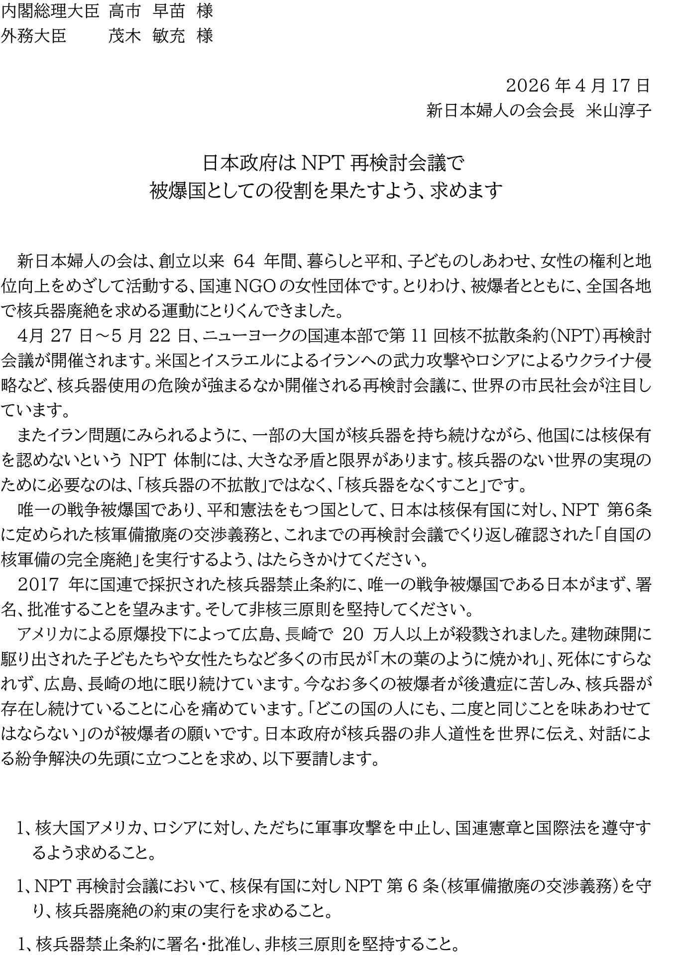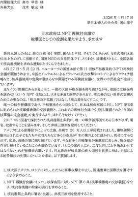 新日本婦人の会は4月17日、日本政府に対して「NPT再検討会議で被爆国としての役割を果たすよう」求める要請、核保有五カ国に対して「NPT再検討会議の合意形成に力を尽くし、『核兵器廃絶を達成するという明確な約束』を実行するよう求める要請文を送りました。