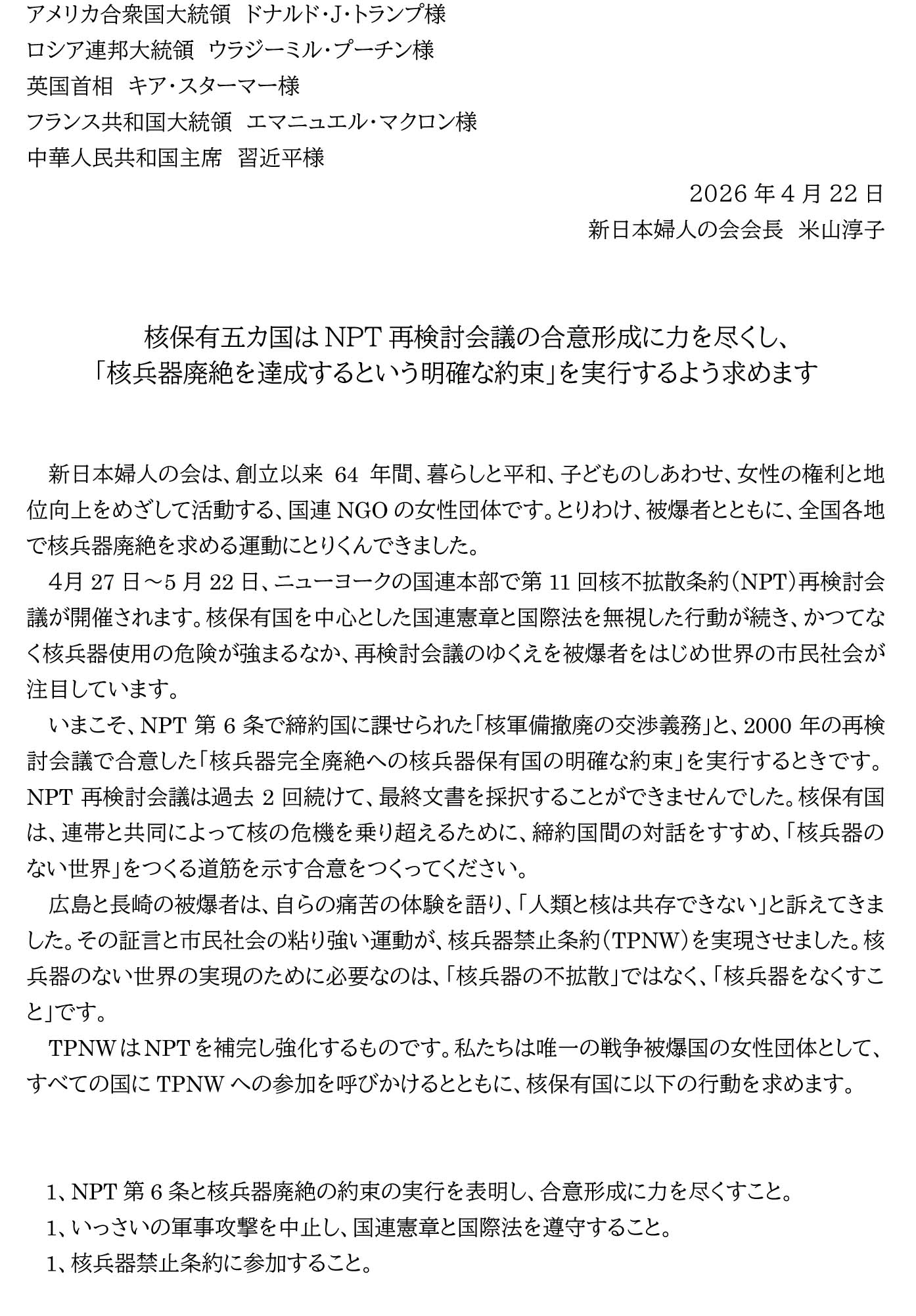 NPT再検討会議にあたり、日本政府と核保有国への要請