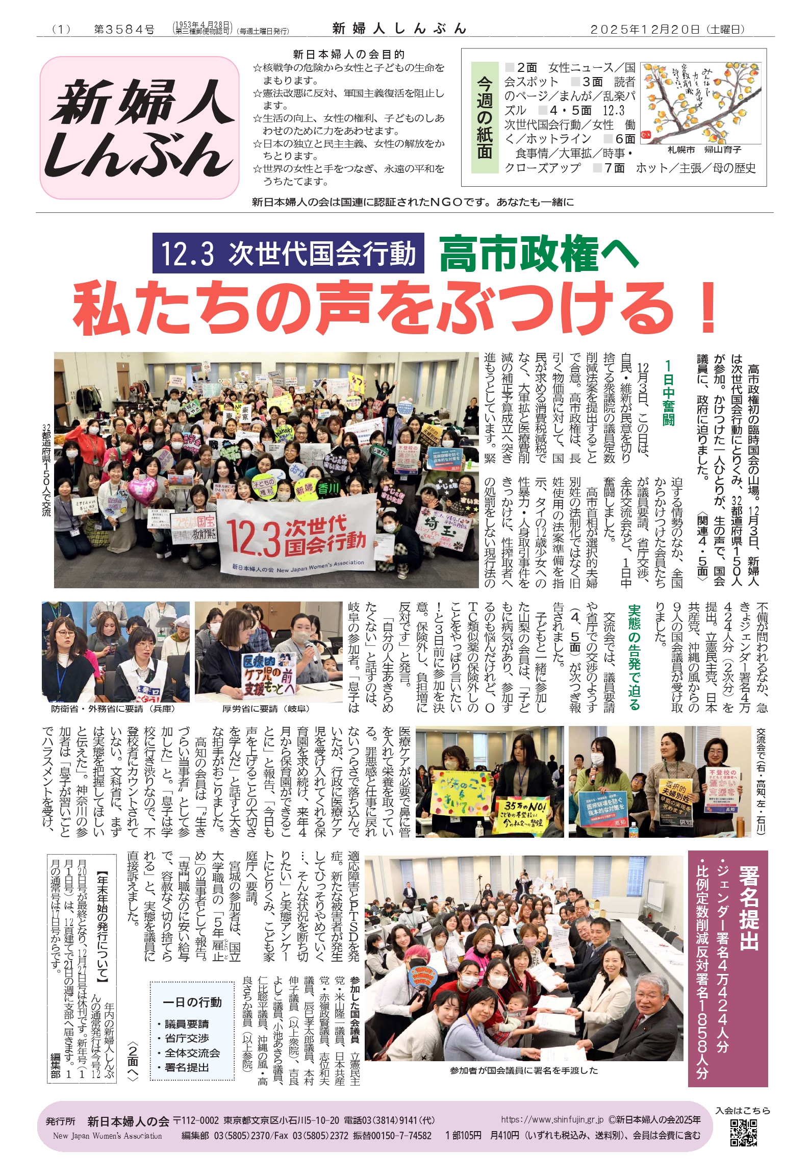 高市政権初の臨時国会の山場。12月3日、新婦人は次世代国会行動にとりくみ、