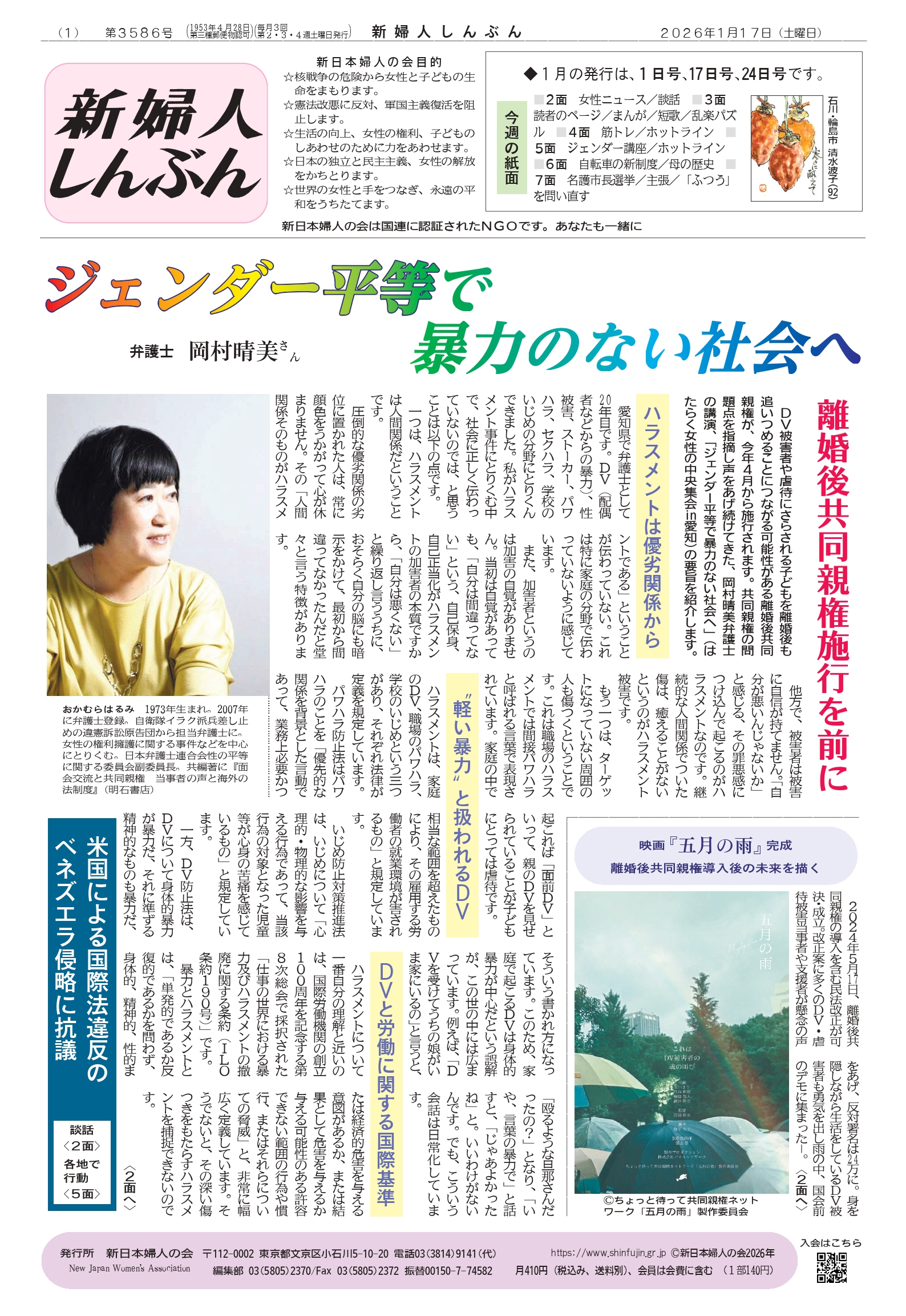 DV被害者や虐待にさらされる子どもを離婚後も追いつめることにつながる可能性がある離婚後共同親権が、今年4月から施行されます。共同親権の問題点を指摘し声をあげ続けてきた、岡村晴美弁護士の講演、「ジェンダー平等で暴力のない社会へ」(はたらく女性の中央集会in愛知)の要旨を紹介します。
