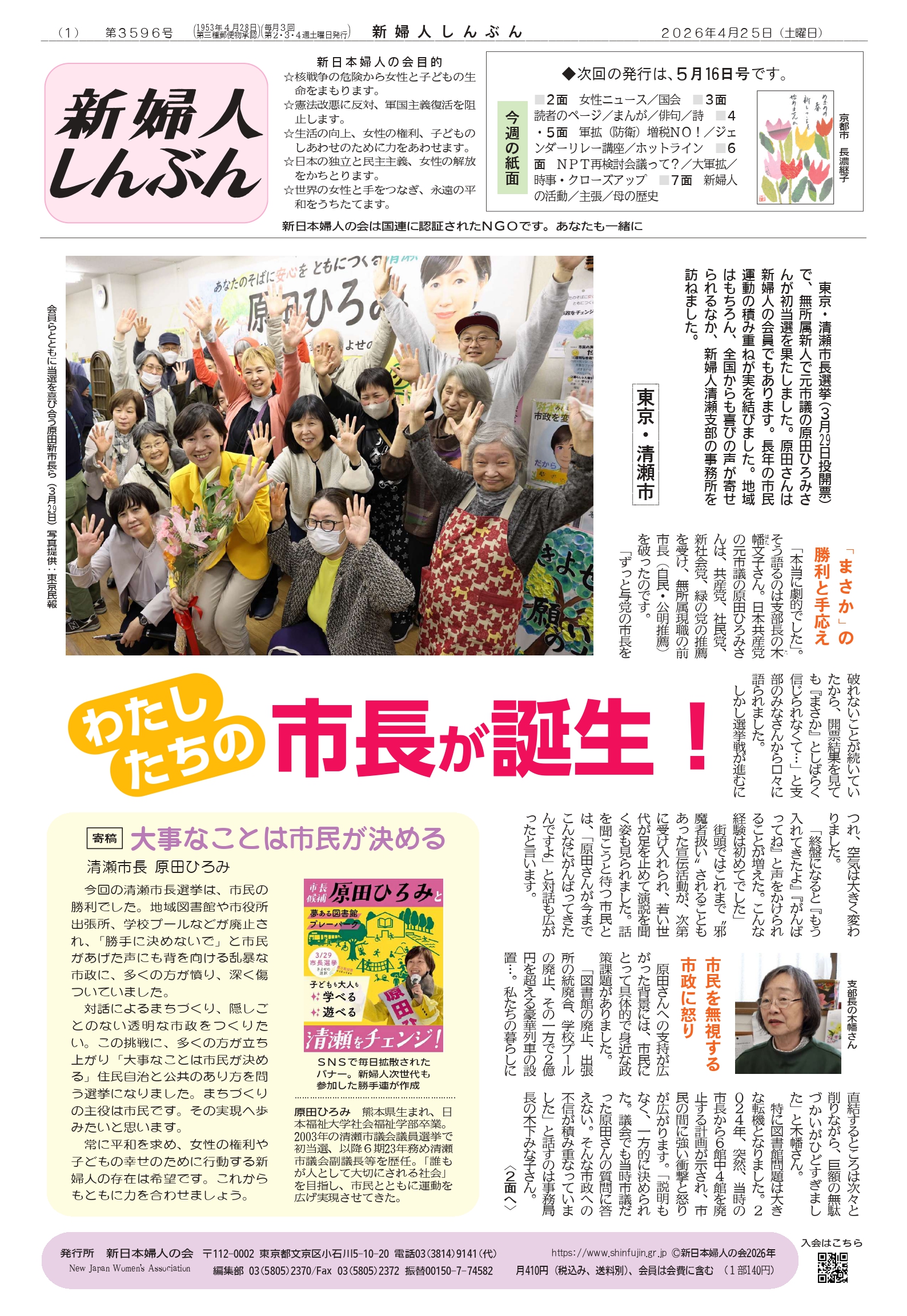 東京・清瀬市長選挙(3月29日投開票)で、無所属新人で元市議の原田ひろみさんが初当選を果たしました。原田さんは新婦人の会員でもあります。長年の市民運動の積み重ねが実を結びました。地域はもちろん、全国からも喜びの声が寄せられるなか、新婦人清瀬支部の事務所を訪ねました。
